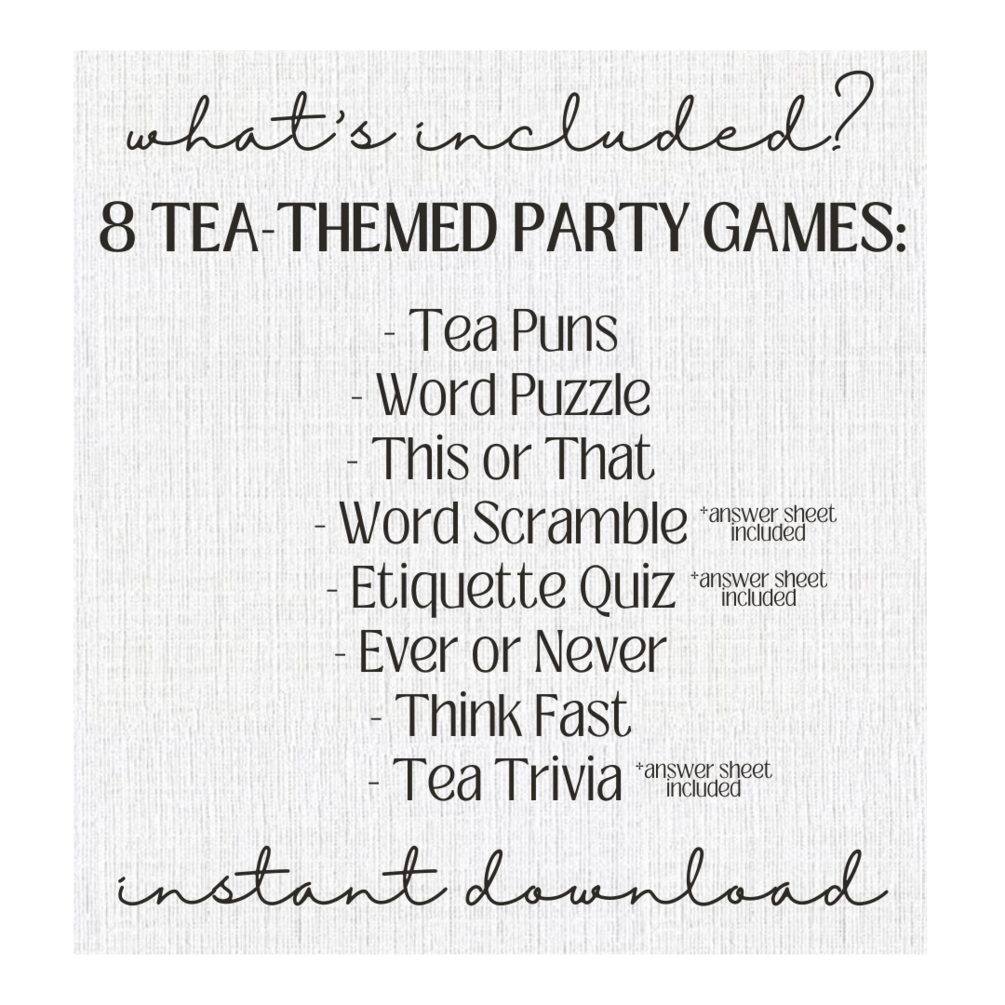 This Printable Afternoon Tea Party Game Bundle includes these games, all tea-themed: