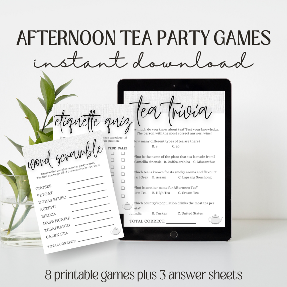 It also includes answer sheets for Word Scramble, Etiquette Quiz and Tea Trivia.